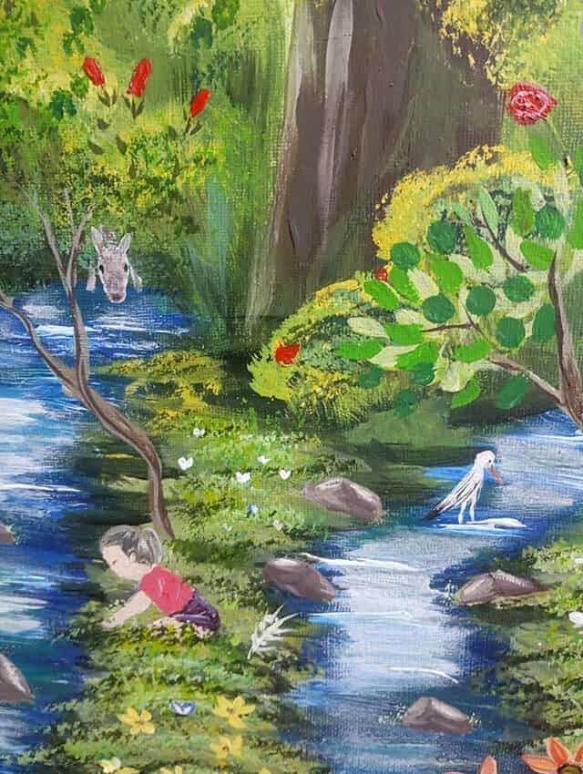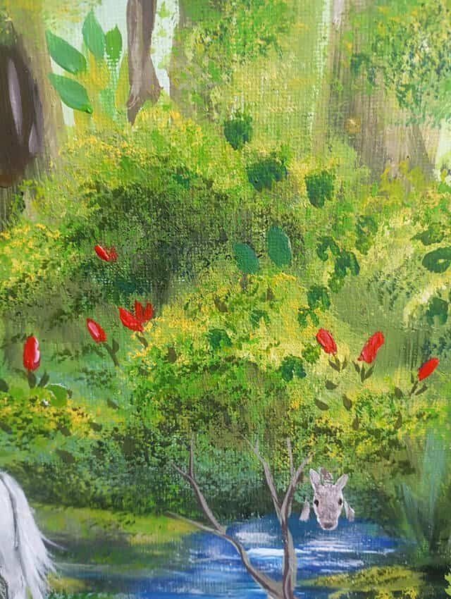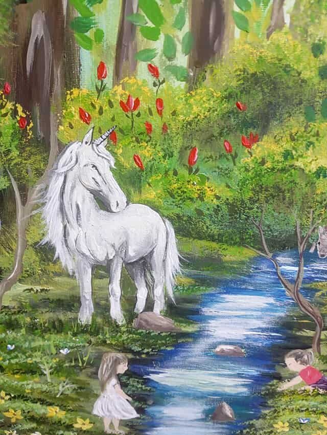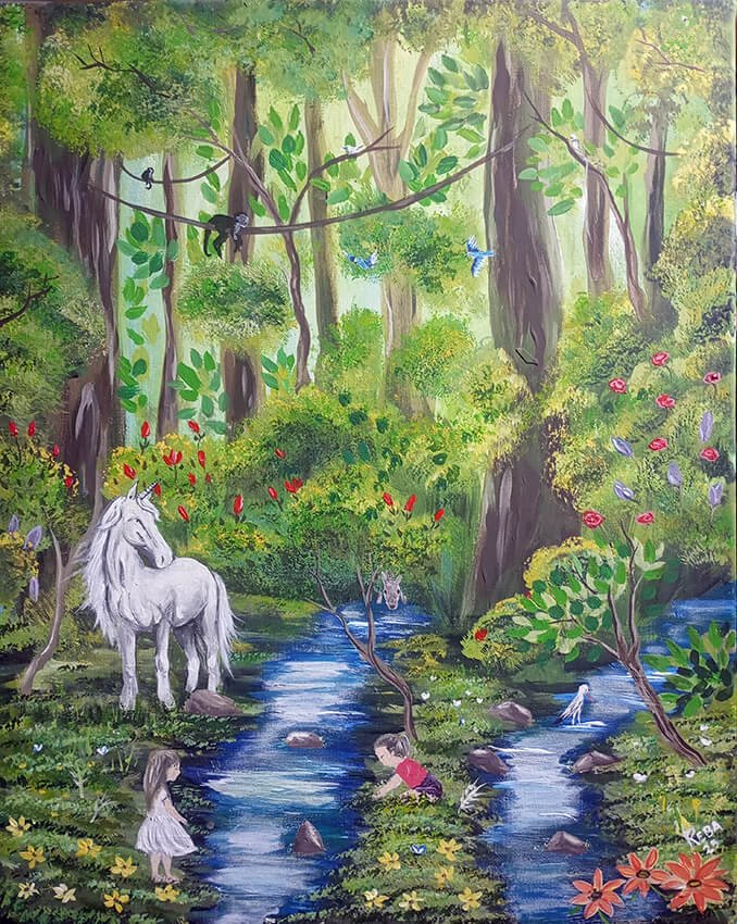 Listening to the song of the birds, the music of the forest comes alive. Fairies dance in the breeze, unicorns stand as their guardians, and the animals feel the power of love. The girls play by the stream, letting the cool water tickle their feet. Here, time stands still. Enter this calm. Come to this place.